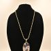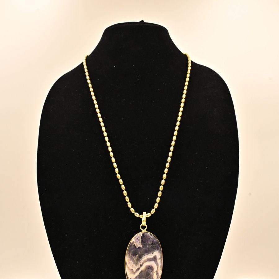 Simple gold-plated ball chain necklace ending in a large oval polished amethyst (purple banded chalcedony) pendant, displayed on black mannequin.