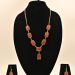 This necklace set displays seven rectangular carnelian beads in a warm burnt orange hue, linked by fine gold-plated chains in a graceful elongated drop style, complemented by matching stud earrings.