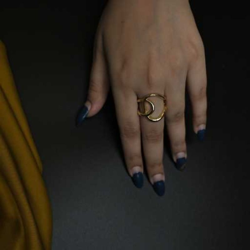 The ring is a simple, polished gold band with a smooth, rounded profile. It features a clean and timeless design that sits elegantly on the finger, contrasting beautifully with the deep blue nail polish.