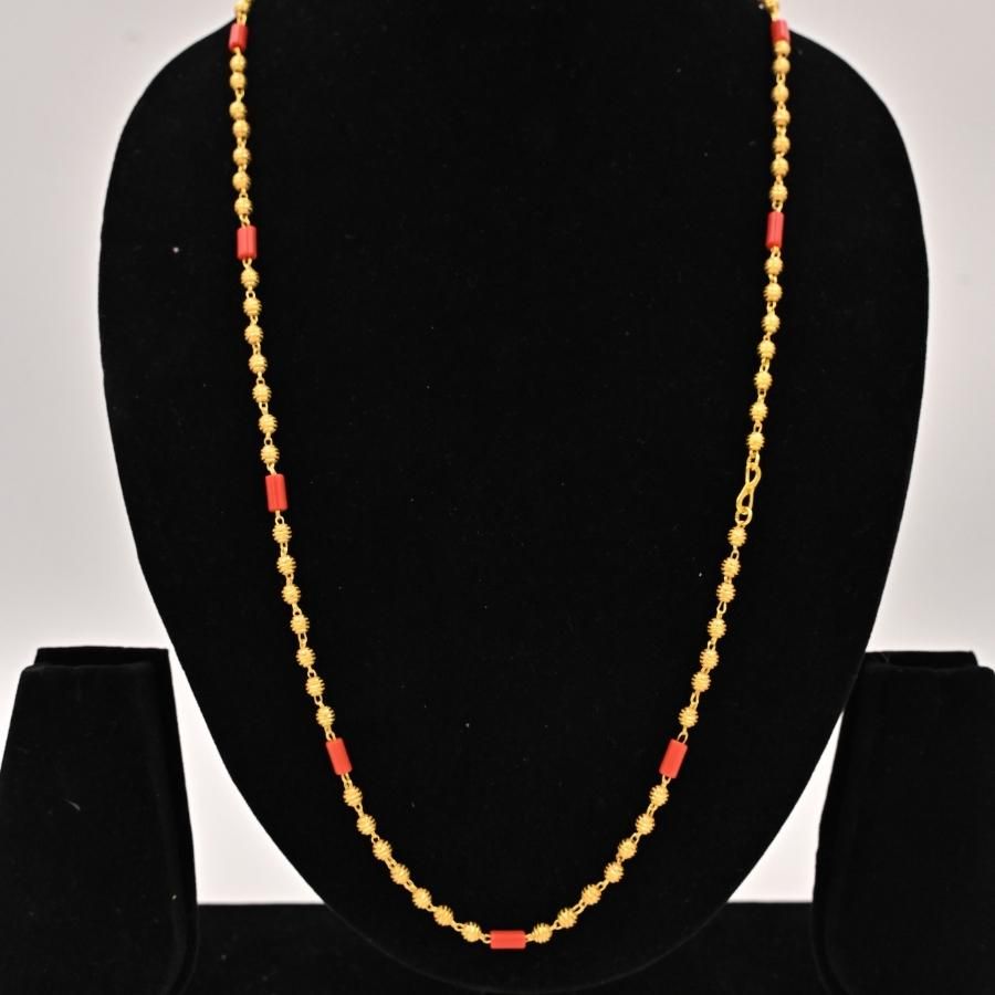 This classic necklace combines a fine gold bead chain with alternating cylindrical coral beads, offering a vibrant red-gold contrast.
