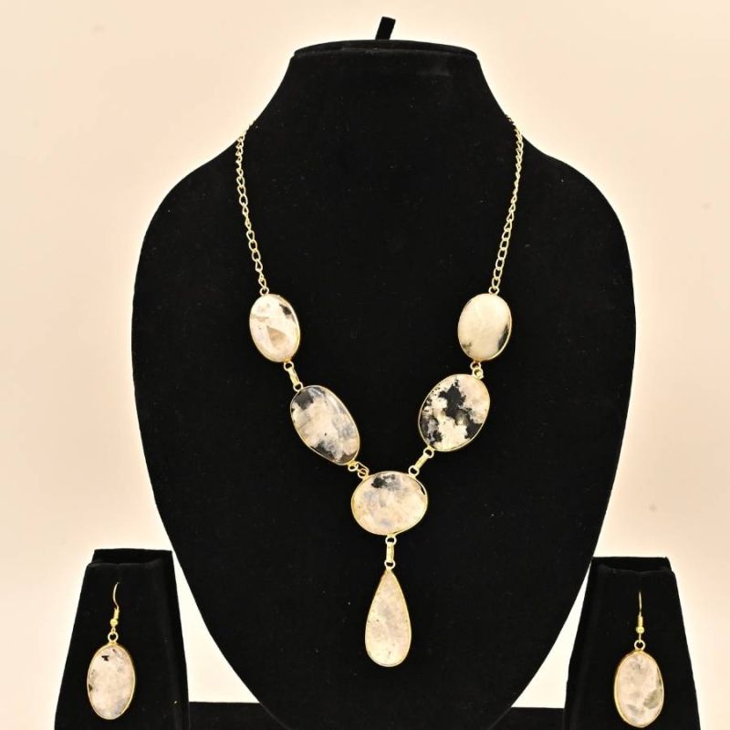 This necklace set showcases five large oval dendritic agate stones in creamy white-grey tones with intricate tree-like or landscape inclusions, strung on gold-plated chain links, accompanied by simple drop earrings featuring matching small dendritic agate pieces.