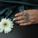 A decorative ring worn on a hand featuring a stylish gold and black manicure. The piece is presented in a refined still life setting, paired with a white daisy against a dark satin background to create a chic and sophisticated visual contrast.