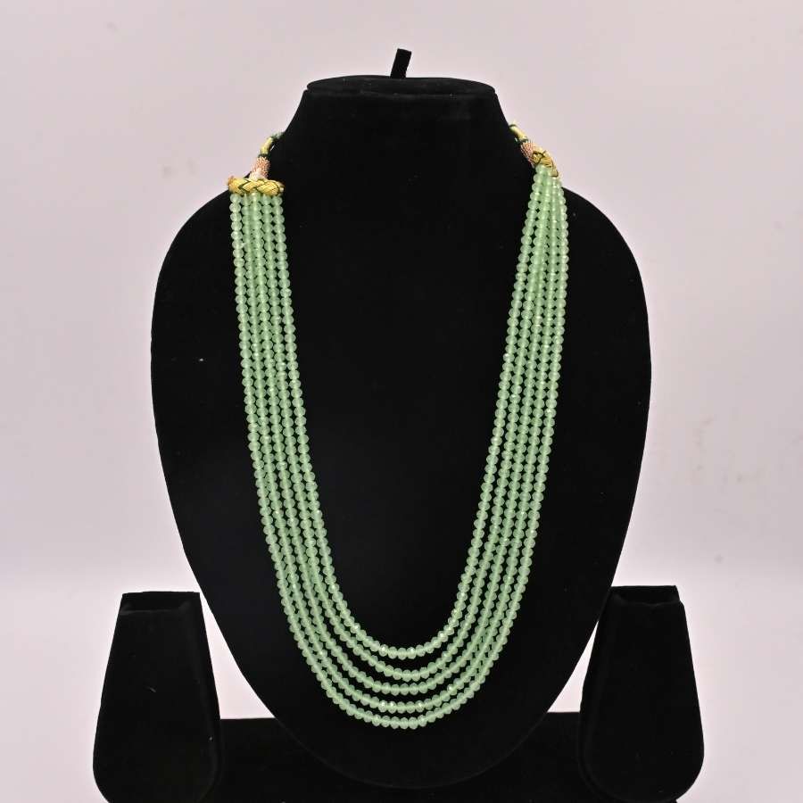 5-String Green Beads Mala Necklace (or Hakkai-Style Bead Choker with Tassels). A vibrant Indian-inspired layered piece for festive looks.