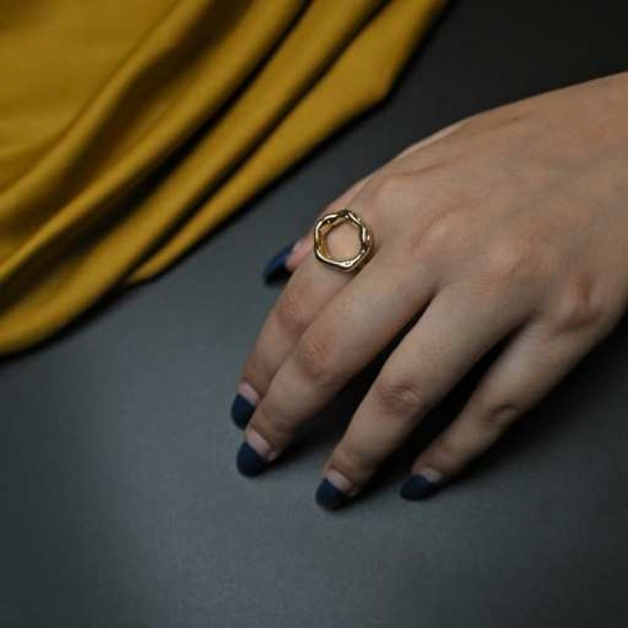 The ring is a gold band featuring a distinct geometric design with a structured, asymmetrical shape. It has a modern, architectural look with smooth surfaces and clean lines, standing out against the deep blue nail polish.