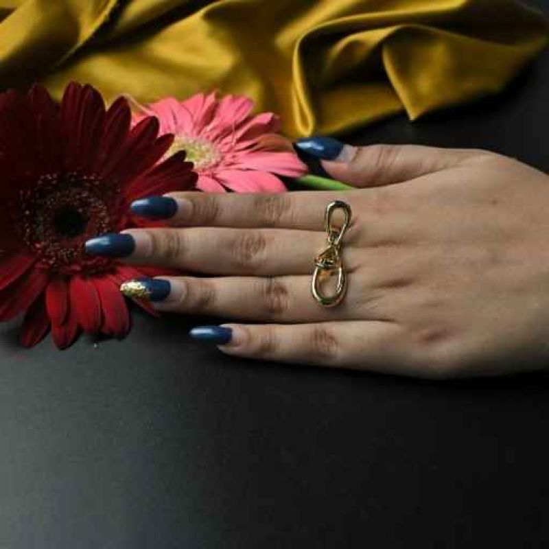 The ring features a unique design resembling a segment of a gold chain, with interconnected links wrapping around the finger. It has a textured, metallic look with a high-polish finish, adding an edgy and modern touch to the elegant display.