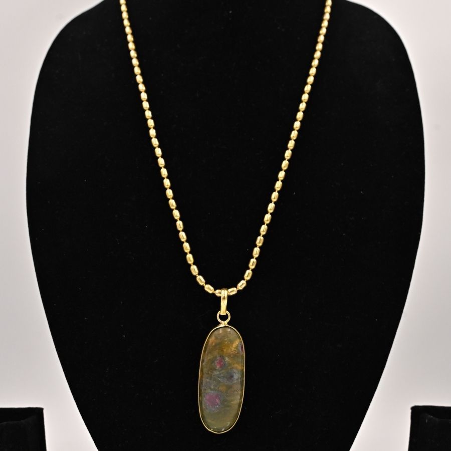 This necklace features a delicate gold chain paired with an oval pendant showcasing rhodonite—a semi-precious stone with distinctive pink, brown, and black chatoyant patterns.