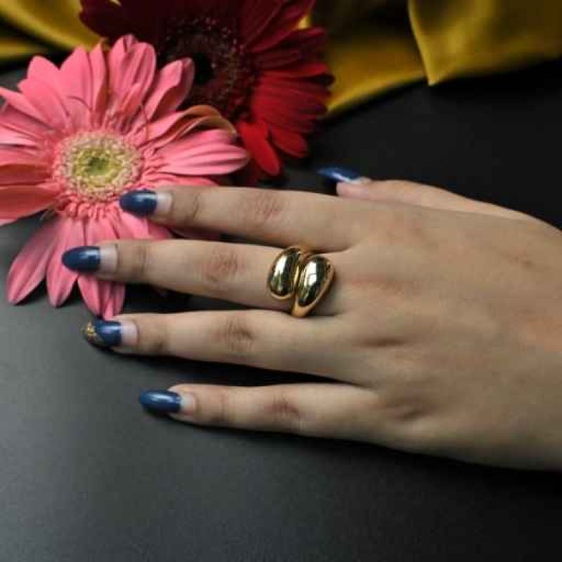 The ring is a gold band featuring two interlocking or adjacent oval loops, creating a modern and geometric silhouette. It has a polished, metallic finish that stands out against the blue nail polish and complements the vibrant floral and fabric background.