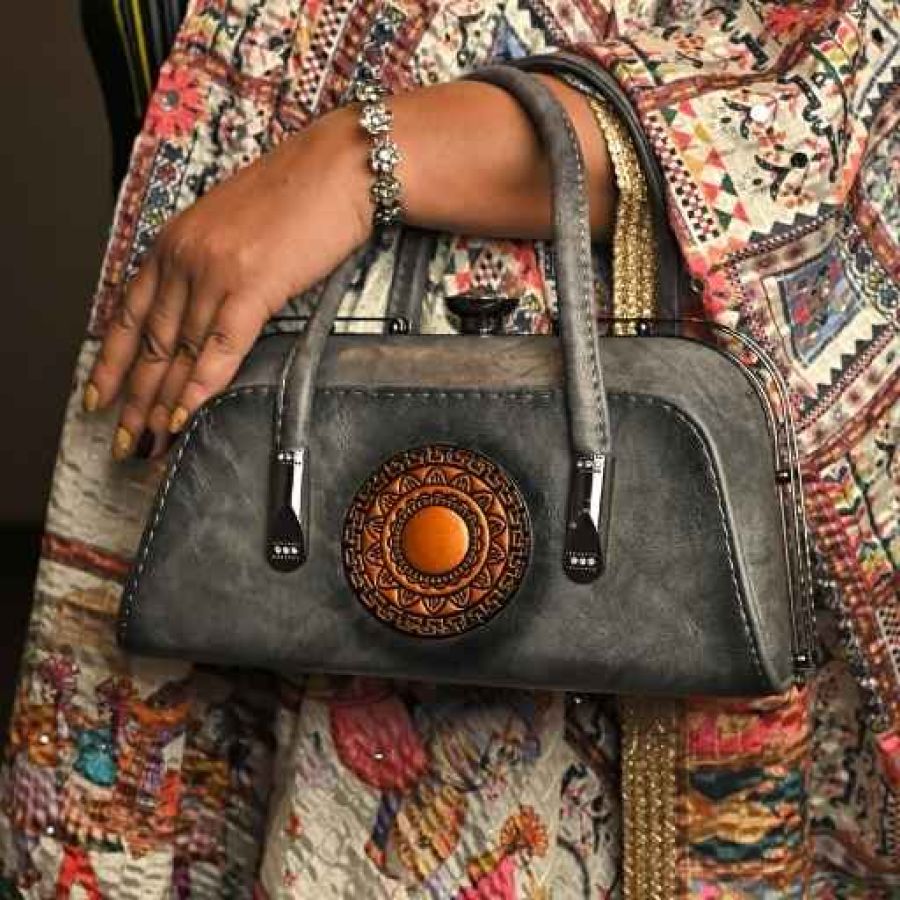 This elegant gray textured structured handbag features prominent gold-tone top handles and clasps, highlighted by a striking orange circular embossed medallion on the front.