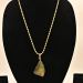 Gold-plated ball chain necklace featuring a triangular polished labradorite pendant with iridescent blue-gray flash, displayed on black mannequin