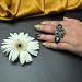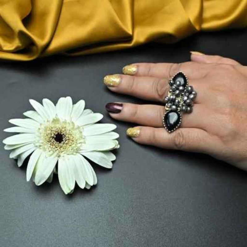 This bold and sophisticated ring features a striking combination of a deep black gemstone and a lustrous pearl, set in a substantial design that commands attention. The contrast between the dark stone and the classic white pearl creates an elegant, high-contrast aesthetic. In the image, the ring is modeled on a hand with a stylish manicure incorporating gold and dark tones, which complements the jewelry perfectly.