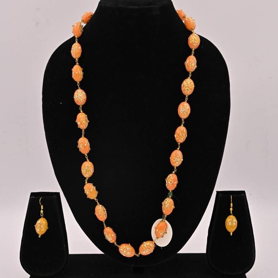 This is a traditional Indian necklace set featuring a long strand of textured orange beads (resembling seeds or pearls) connected by gold-plated links, paired with matching drop earrings