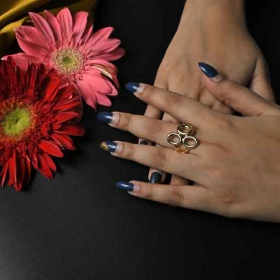 The ring is a gold band featuring a distinct ribbed or rope-like textured design that wraps around the finger. It has a substantial, classic look with a high-polish finish, which contrasts elegantly with the deep blue nail polish and the vibrant red and pink gerberas.