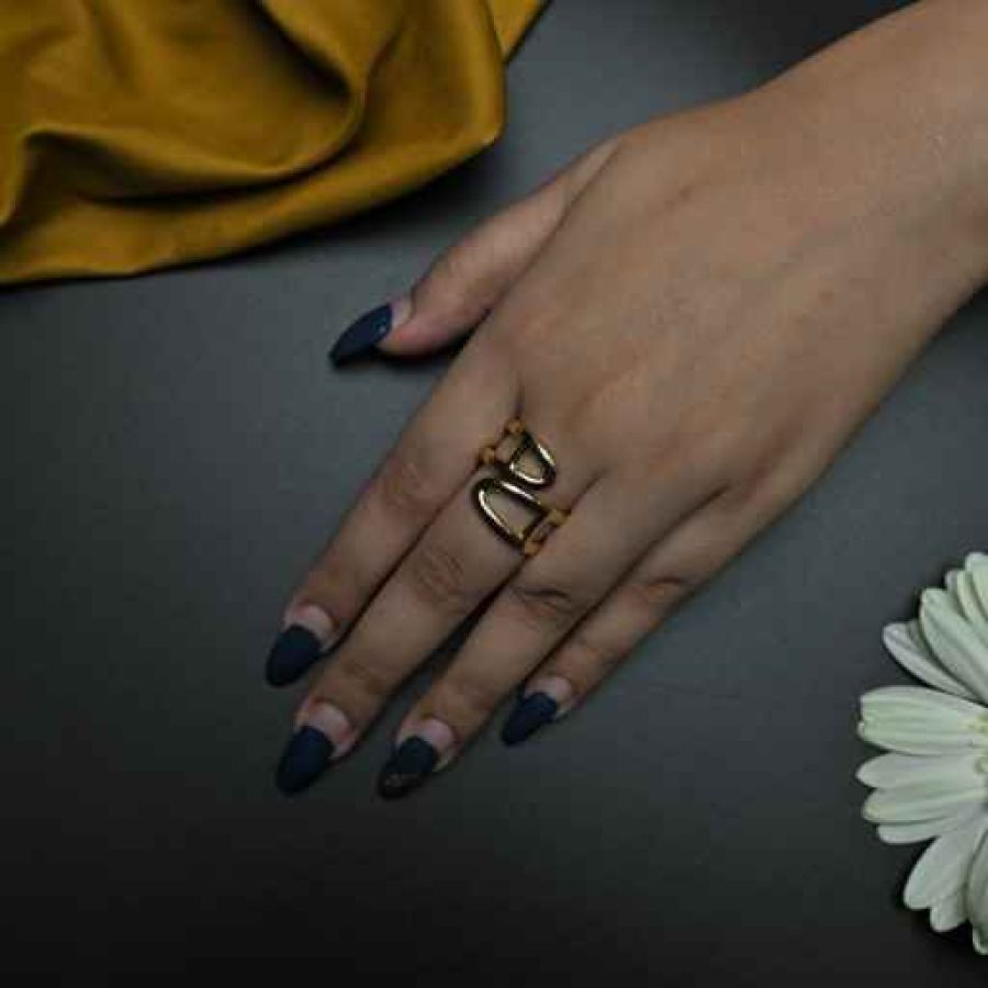 The ring is a gold band featuring a distinct ribbed or rope-like texture that wraps around the finger. It has a substantial, classic design with a high-polish finish that contrasts elegantly with the deep blue nail polish.