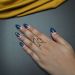 The hand rests on a grey surface with yellow fabric in the background, showcasing a stylish combination of nail art and jewelry.