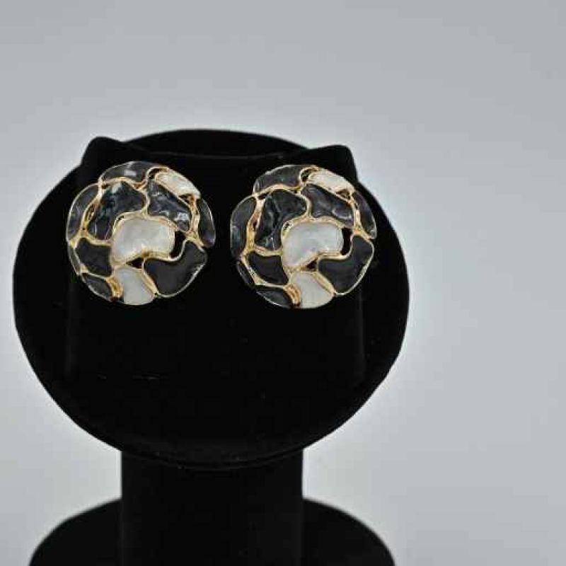 These are stud earrings featuring an abstract floral-inspired design with black and white enamel (or similar material) set against gold-tone outlines, creating a bold, artistic pattern. The earrings are displayed on a black stand, emphasizing their intricate color contrast and decorative style.