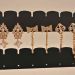 Six pairs of gold-style earrings are displayed on a grooved black stand against a light background. The collection features diverse designs, including leaf shapes, flowers with square pendants, bow styles, and diamond-shaped floral motifs, presenting an exquisite jewelry display scene.