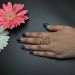 The ring is a simple, polished gold band with a smooth and rounded profile. It features a clean, timeless design that sits elegantly on the finger, complementing the blue and white nail art and the surrounding floral arrangement.
