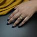 The ring is a gold band featuring a distinct textured or ribbed pattern around the exterior. It has a substantial look with a high-shine finish that stands out against the dark blue nail polish.