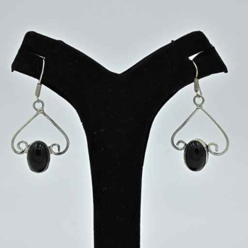 These are silver-toned dangle earrings featuring dark oval stones (likely onyx or similar) set in decorative wire frames with heart/teardrop shapes and subtle scrollwork details. The earrings hang from fishhook ear wires and are displayed on a black earring stand.