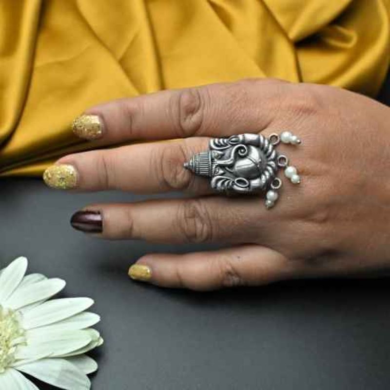 This exquisite ring features a lustrous pearl set within a polished silver band, blending vintage charm with modern sophistication. The design highlights the natural beauty of the pearl against the cool tone of the metal. In the display image, the ring is modeled on a hand with a stylish two-tone manicure (gold and dark brown), set against a vibrant yellow satin background and accented with white flowers, creating a rich and luxurious aesthetic.