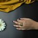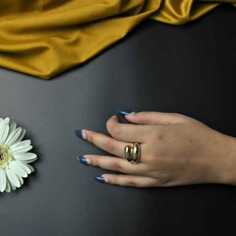 The ring is a gold band featuring a distinct ribbed or rope-like textured design that wraps around the finger. It has a substantial, classic look with a high-polish finish, which contrasts elegantly with the blue nail polish and complements the white daisy and yellow fabric accents.