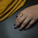 The ring is a gold band featuring a distinct geometric design with a structured, asymmetrical shape. It has a modern, architectural look with smooth surfaces and clean lines, standing out against the deep blue nail polish.