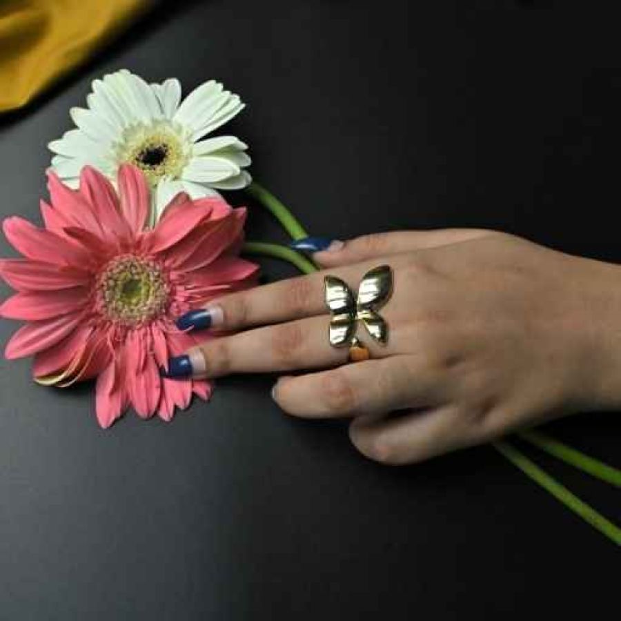 The ring is crafted from gold and features an intricate butterfly design with detailed wings. The butterfly appears to be perched delicately on the band, with a high-polish finish that adds a whimsical and elegant touch to the look.