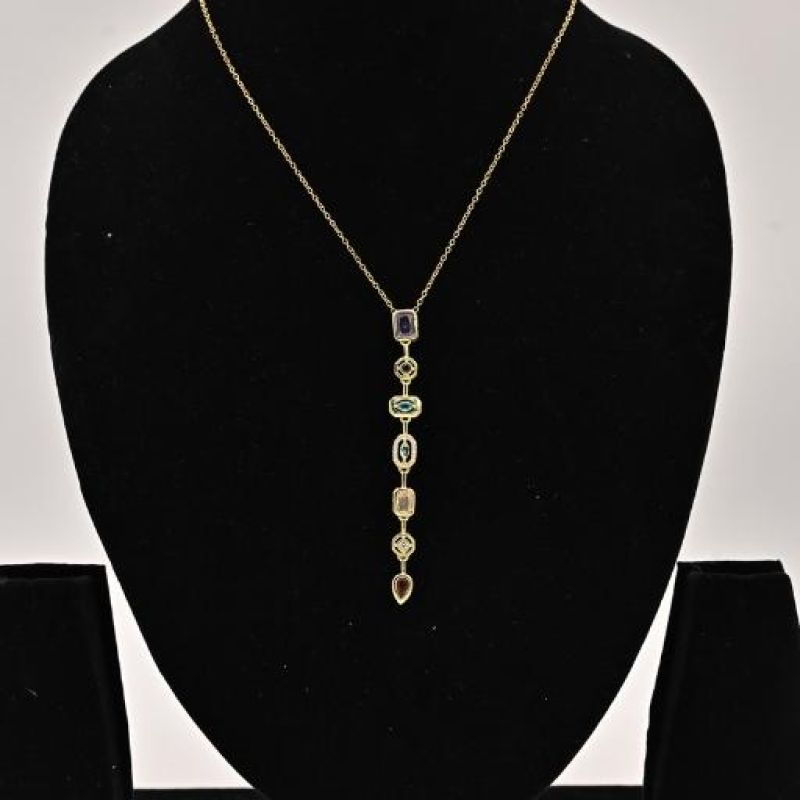 This elegant gold dropsy necklace features a vertical chain with multiple emerald-cut and oval gemstones in purple, green, and turquoise hues, tapering to a teardrop pendant at the bottom.