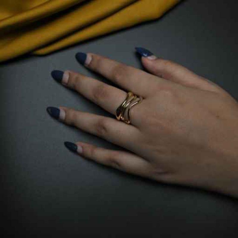 The set consists of multiple gold rings worn together on the finger. They feature a mix of delicate bands and a central ring with a light-colored, iridescent gemstone, creating a layered and elegant look.
