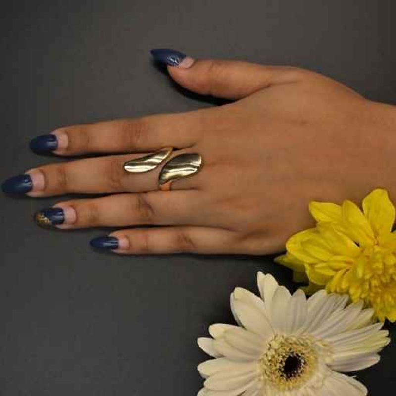The set features two gold rings worn together, including a simple band and a second ring adorned with a small, light-colored gemstone. The combination creates a delicate and layered look that complements the blue and light-colored nail art.