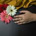 The ring is a gold band featuring a distinct ribbed or rope-like textured design that wraps around the finger. It has a substantial, classic look with a high-polish finish, which contrasts elegantly with the deep blue nail polish and complements the vibrant red, white, and pink gerberas.