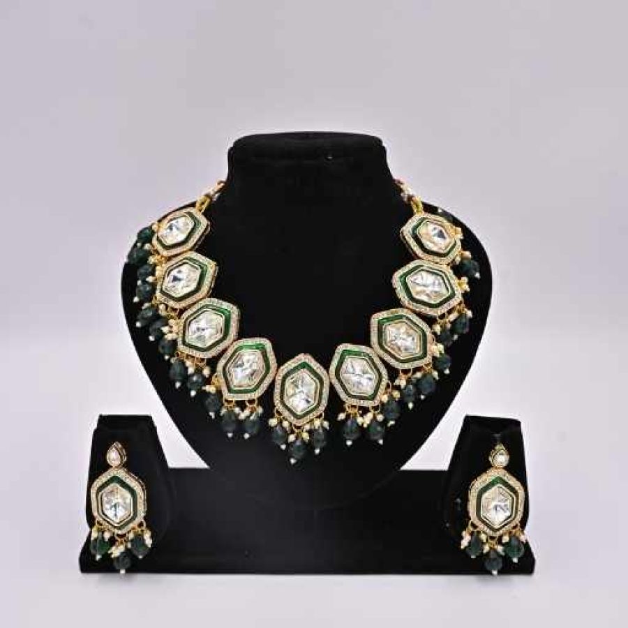 This striking green meenakari choker necklace features hexagonal uncut diamond-like polki stones set in gold-toned metal with intricate detailing and dangling bead fringe.