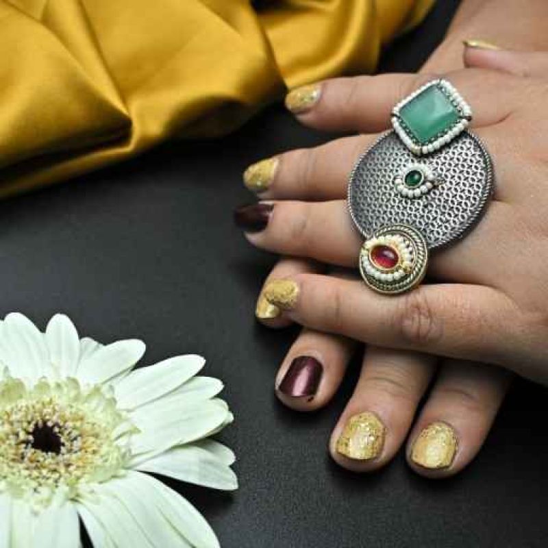 This bold and decorative ring features a striking design centered around a large, square-cut green gemstone, complemented by a vibrant red stone and a unique silver disk element. The combination of geometric shapes and vivid colors creates a luxurious, high-fashion look. In the image, the ring is worn on a hand with a glamorous manicure combining deep purple and gold glitter polish.