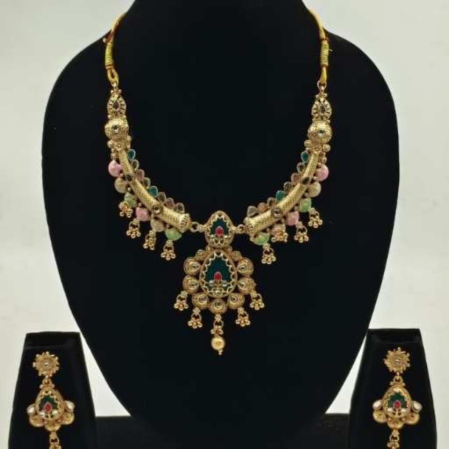 This traditional Kundan necklace set features intricate gold-toned filigree work with multicolored kundan stones in pink, green, and clear hues.