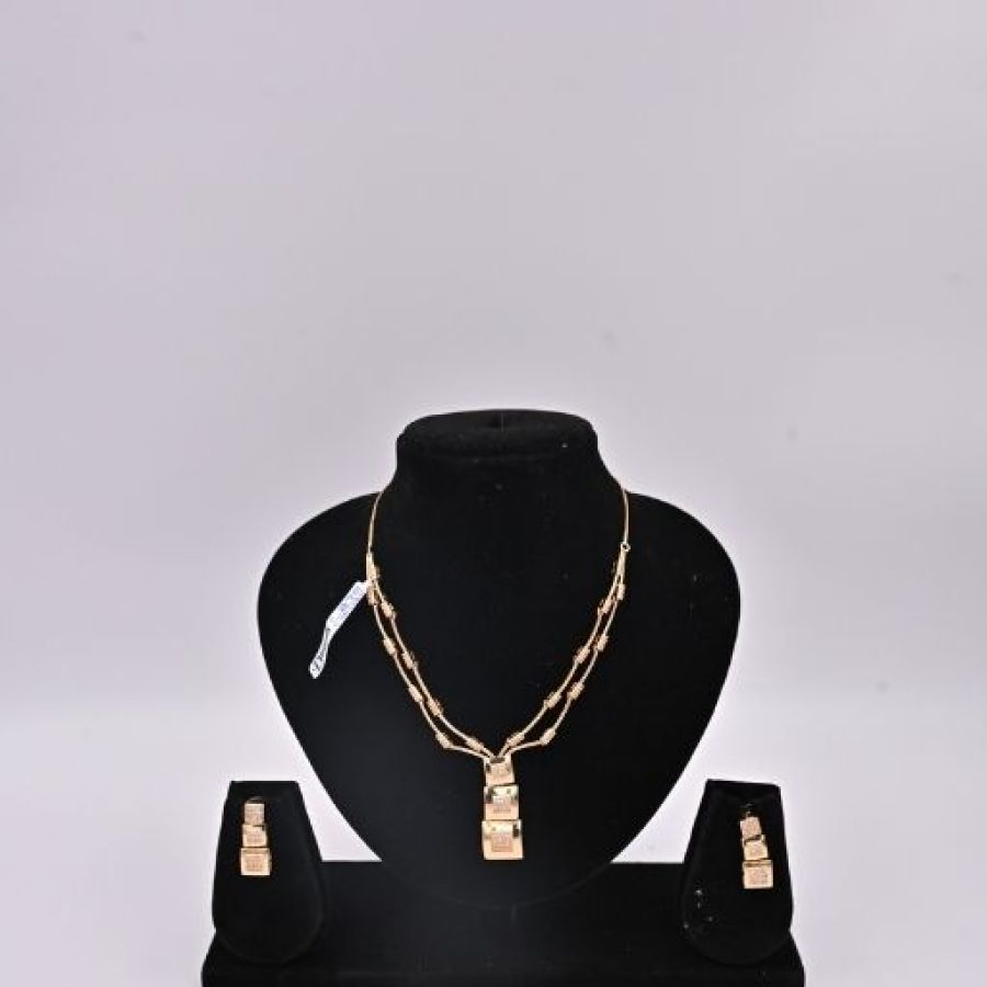 This elegant double-layered gold-toned necklace features rectangular polki or CZ stones with delicate chain links and a central droplet pendant for added sparkle.