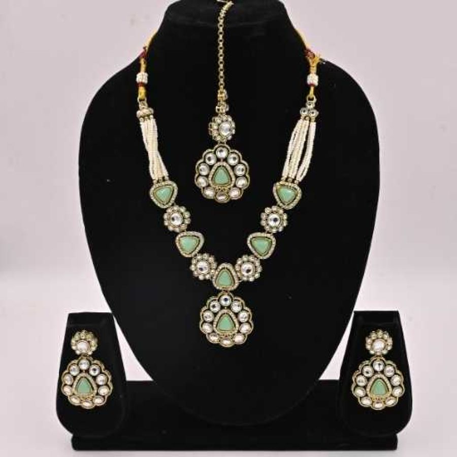 Elegant kundan necklace set featuring mint green pear-shaped stones framed by white polki and tiny pearl strands, paired with matching statement earrings for bridal and festive wear.