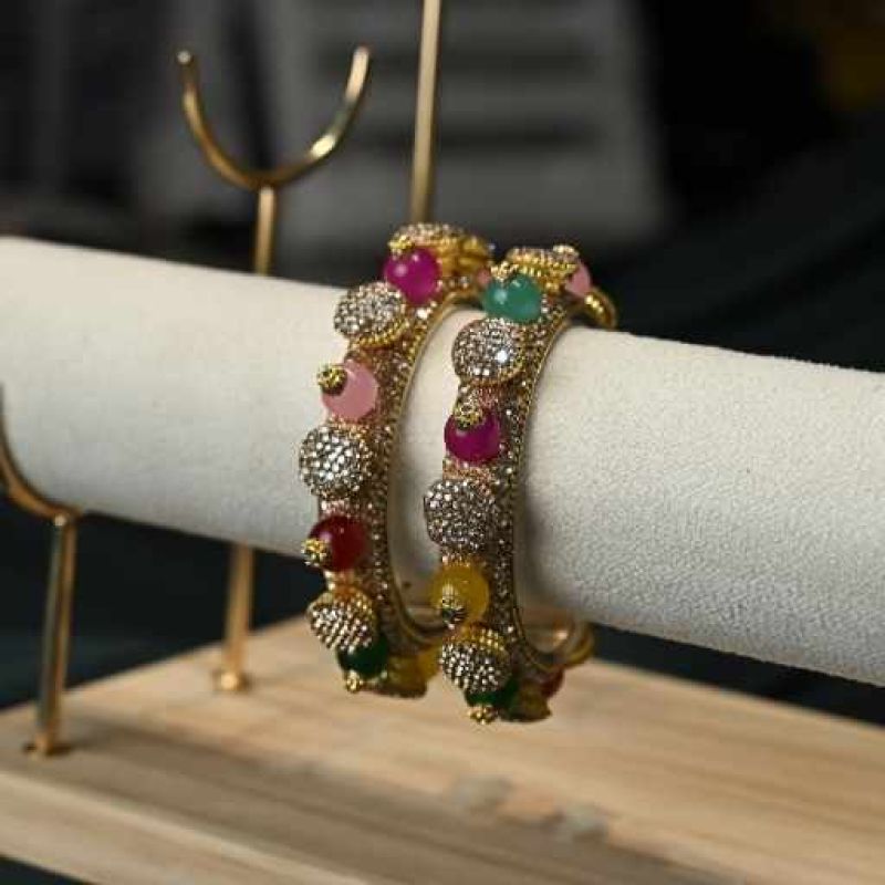 These are a pair of gold-plated wide bangles featuring colorful semi-precious beads—pink, green, yellow—and round CZ or diamond accents in a beaded chain pattern. The vibrant gemstone mix and dangling elements create a boho-luxury ethnic vibe perfect for Indian weddings, parties, or festive wear. Adjustable design offers comfortable sizing for versatile stacking.Untitled-design-7.jpg