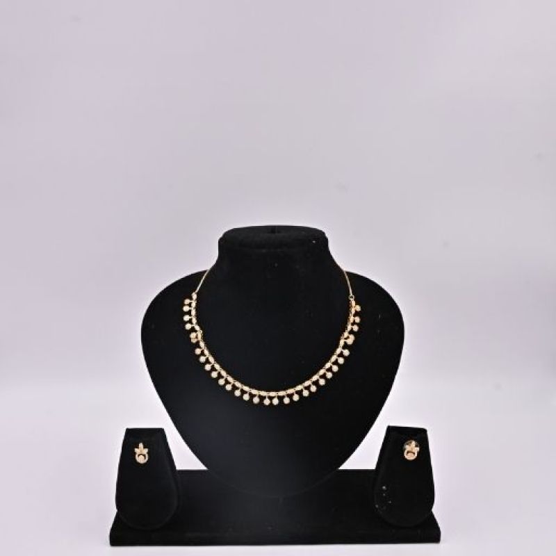 Delicate gold-tone necklace with bead accents paired with stud earrings, presented on a jewelry stand for an elegant look. Ideal for daily wear or gifting.