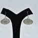 These are silver-toned dangle earrings featuring oval-shaped charms with intricate decorative patterns. The design includes a central dotted or beaded pattern surrounded by detailed borders and engravings. The earrings hang from fishhook ear wires and are displayed on a black earring stand.