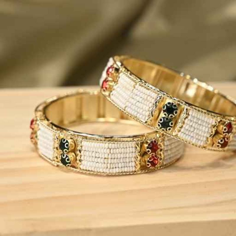 These are a pair of gold-plated ethnic bangles featuring intricate white pearl beadwork panels with green and red kundan stone accents. The filigree borders add a traditional Rajasthani touch, perfect for festive wear with sarees or lehengas in Kolkata celebrations. Lightweight and adjustable for stacking comfort.