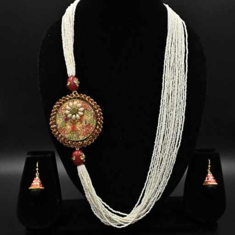 This boho-chic multi-strand pearl necklace features multiple rows of small white beads with an oversized multicolored kundan floral disc pendant on one side, accented by red beaded drops.