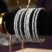 These are a set of eight elegant silver-toned bangles with a braided pearl-like texture and subtle shimmer finish. Ideal for daily or semi-formal wear, they stack beautifully with other ethnic jewelry for Kolkata's modern traditional look. Lightweight and adjustable for comfort.