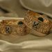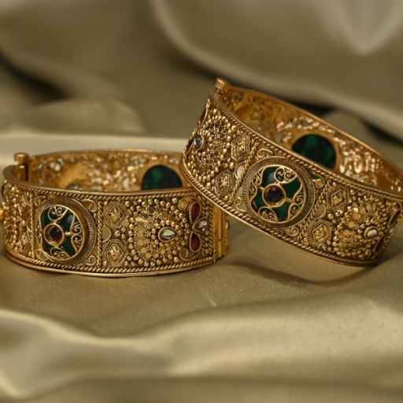 These are a pair of ornate gold-plated Indian bangles, known as polki or kundan kada, featuring intricate filigree work and floral motifs. They are adorned with prominent round green stones—likely emeralds or onyx—set in enamel or meenakari, along with smaller multicolored gems for a traditional bridal look. The design includes detailed jaali patterns and a secure clasp, making them ideal for ethnic wear during weddings or festivals.