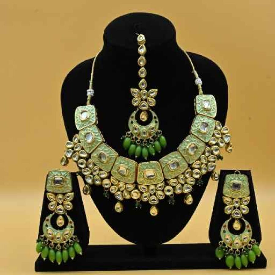 This traditional polki kundan necklace set features gold-toned filigree work with multicolored semi-precious stones in green, pink, and clear tones, plus intricate floral motifs and dangling beads.