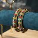 These are a pair of gold-toned ethnic bangles featuring vibrant multicolored square kundan or rhinestone inlays in shades of green, pink, blue, red, and yellow. The mosaic pattern creates a bold, chunky look perfect for festive occasions like weddings or parties with lehengas and sarees in Kolkata style. Adjustable and lightweight for stacking with other churis.