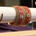 These are a pair of bold gold-plated wide bangles in vibrant red, featuring striped bands of cubic zirconia (CZ) rhinestones and dangling chandelier-style motifs with central diamond accents. The ornate, textured design delivers a dramatic, traditional Indian bridal or festive vibe, perfect for high-impact ethnic ensembles. Adjustable sizing ensures a secure fit for special occasions.