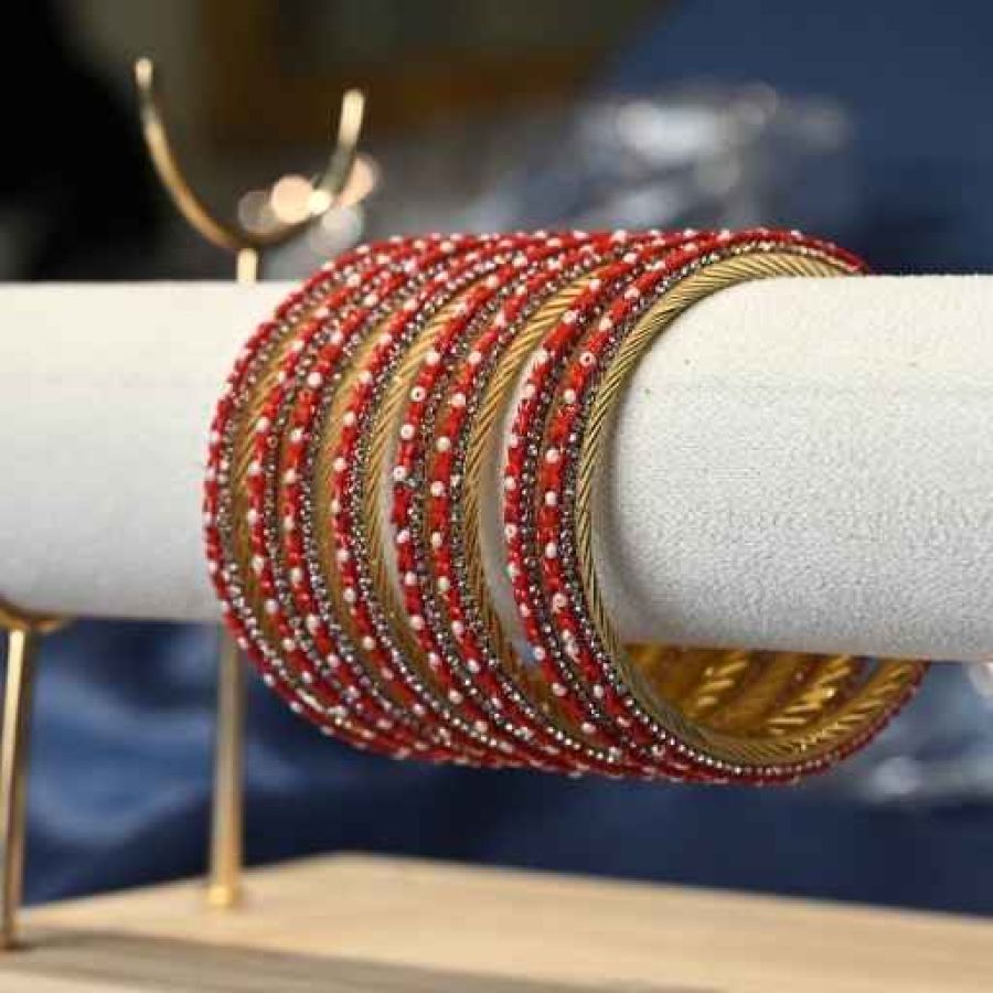 These are a set of eight vibrant red gold-plated glass bangles featuring clusters of white pearls and sparkling cubic zirconia (CZ) rhinestones in dotted patterns. The bold color contrast and shimmering accents create a festive, traditional Indian look perfect for weddings, parties, or ethnic stacking. Lightweight with adjustable sizing for comfortable wear.Untitled-design-7.jpg