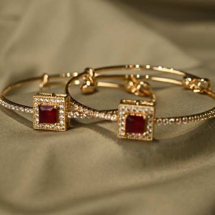 This pair of adjustable gold bangles showcases square ruby (or CZ) center stones framed by pavé crystal detailing on slender hoops with hook clasps. Ideal for ethnic wear, they offer a vibrant red accent with subtle sparkle.