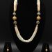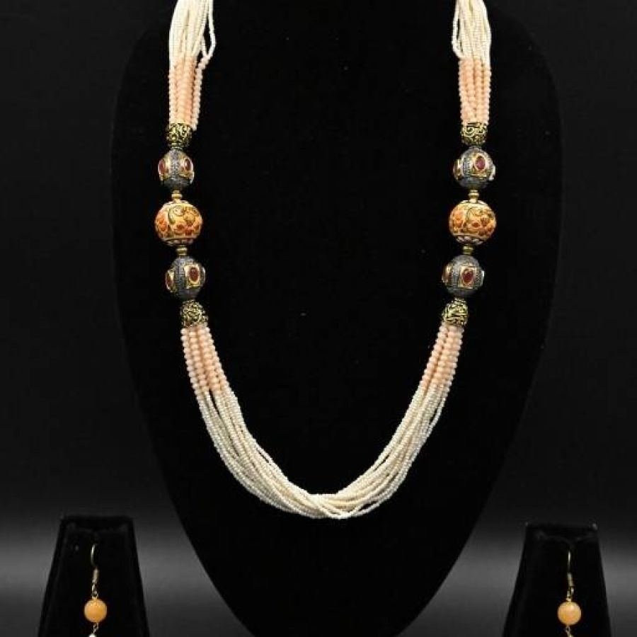 This elegant multi-strand cream pearl necklace features carved antique-finish beads with floral enamel work in warm orange and red tones, spaced along the sides for a regal look.