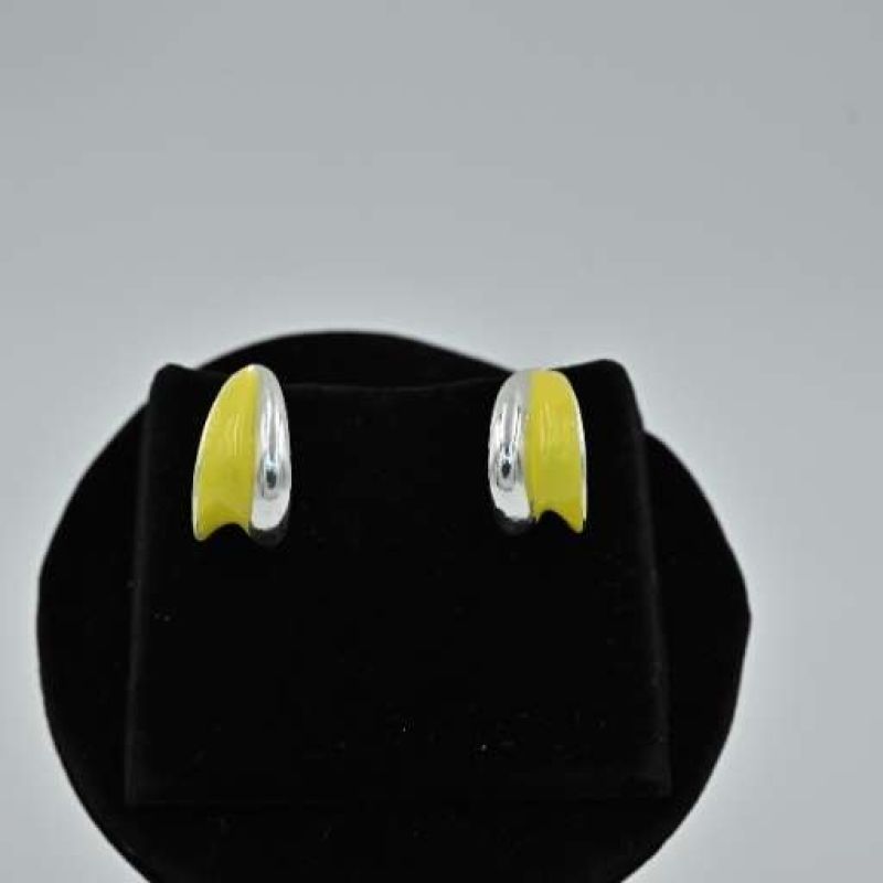 A pair of elegantly designed earrings featuring a curved, arc shape composed of silver and light yellow tones. The earrings are displayed symmetrically on a black circular stand against a minimalist, solid-colored background.